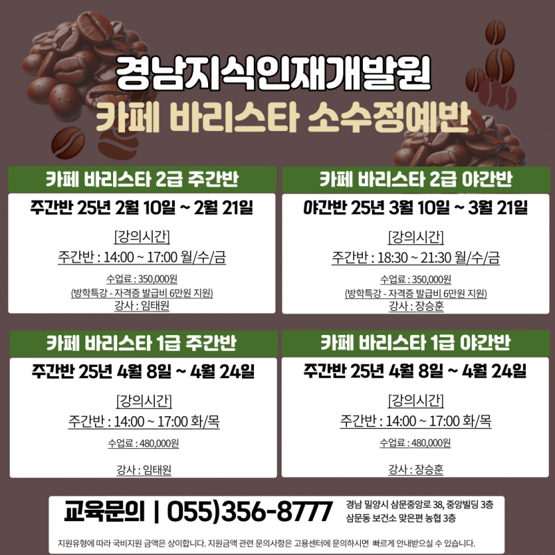 (주)경남지식인재개발원(밀양평생교육원)에서 2, 3, 4 월 평생교육프로그램 안내 드립니다. - 카페 바리스타 1, 2급 / 병원동행매니저 토요반 많은 관심 부탁드립니다. 감사합니다.