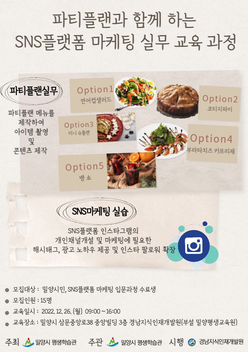 2022년 12월 26일 경남지식인재개발원(밀양평생교육원)에서 2022년 밀양시평생학습관 자격취득형 프로그램 라이크커머스를 부르는 SNS플랫폼 마케팅 입문 과정을 통해 18명의 수료생이 SNS마케팅전문가 자격증을 취득하였으며 이어 심화과정으로 파티플랜과 함께하는 SNS플랫폼 마케팅 실무 …