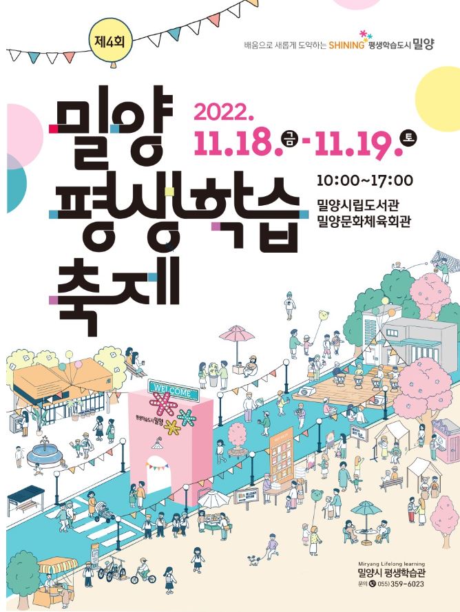경남 밀양시는 오는 18일부터 19일까지 이틀 동안 밀양문화체육회관과 밀양시립도서관에서 ‘배움으로 새롭게 도약하는 SHINING 평생학습도시 밀양!’이라는 주제로 제4회 밀양 평생학습 축제를 개최한다고 밝혔다.코로나19로 인해 3년 만에 개최되는 이번 축제에는 관내 평생교육 유관기관 및 평…