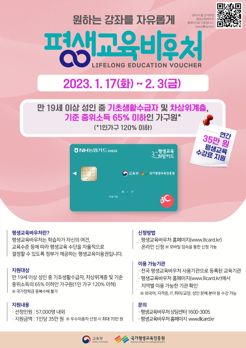 평생교육바우처 카드 신청 선정된 이용자는 NH농협체크카드(평생교육희망카드) 발급 신청 필수※ 카드발급을 위한 NH농협은행 계좌 개설 필요 카드 발급 방법 ① NH농협은행(농ㆍ축협 포함) 영업점 방문※ 영업점 방문 시, 신분증 및 선정 안내 통지서(문자, 이…